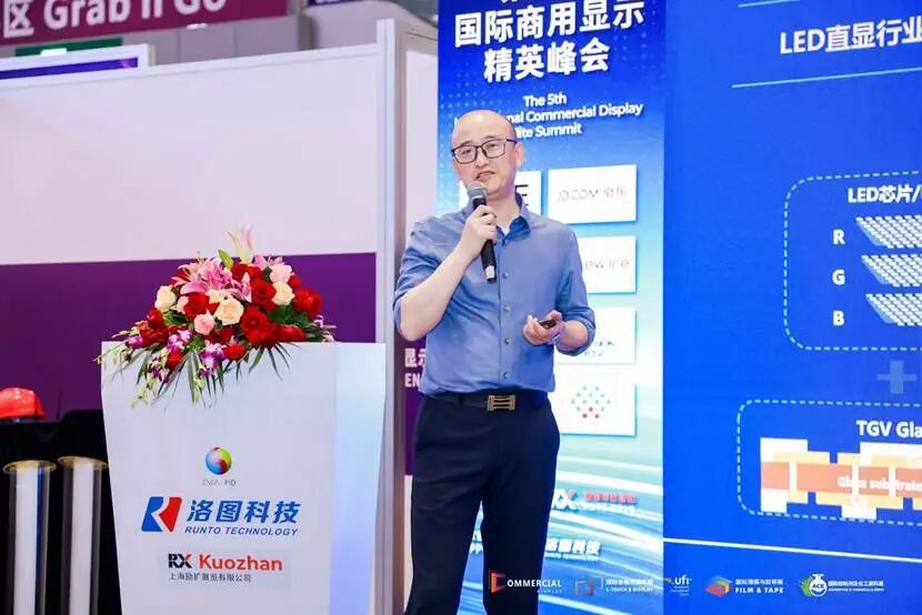 浙江海极半导体技术有限公司董事长兼CEO王春波先生的演讲主题是《进化和融合的力量--一种高性能低成本的MLED解决方案》。报告分析到,传统LED直显产品发展至今,仍然停留在商显领域,成本及性能在消费领域很难平衡;TGV玻璃基载板技术,顺应后摩尔定律先进封装需求诞生及发展,在半导体行业全面稳定量产预计还需时间沉淀。公司基于此背景成立,打造世界首条G4.5+TGV玻璃基专属产线,定位第三代半导体显示行业的领先企业,通过半导体TGV玻璃基技术在显示行业的应用,带来成本及效果的双重跨越提升,推动TGV玻璃基和Micro-LED显示的快速产业化,实现传统LED显示屏向消费电子领域的显示技术迭代进步和商业化进程。