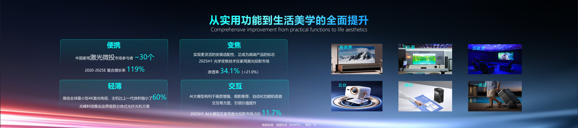 此外,光学变焦技术的渗透率同比增长21个百分点至34.1%;AI大模型的应用占比达11.7%,推动投影设备从“被动显示”向“主动服务”进化。