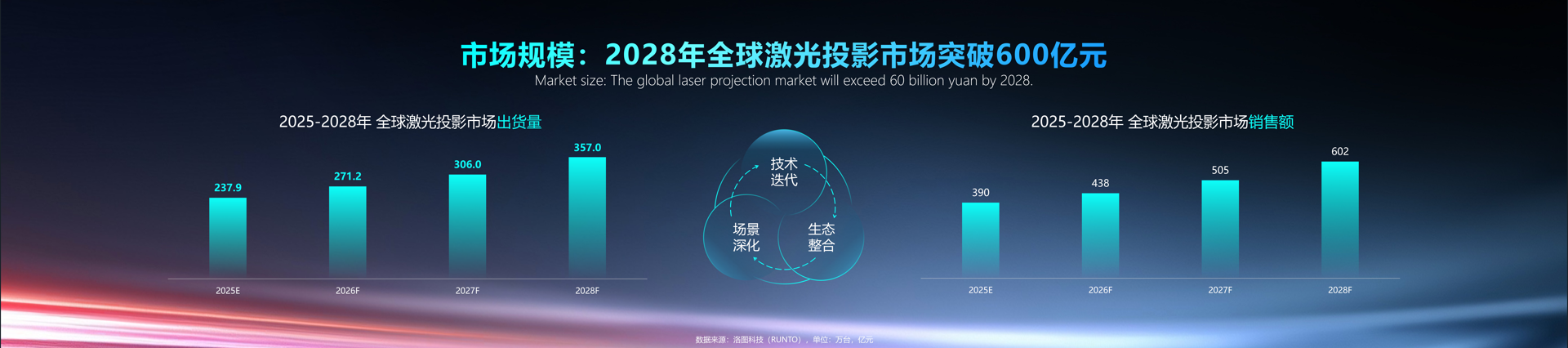在技术、场景、用户的三重驱动下,洛图科技(RUNTO)预测,到2028年,全球激光投影市场的出货量将突破350万台,销售额将超过600亿元。