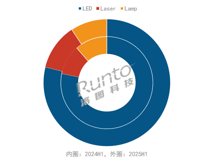 灯泡光源在上半年仅出货83.9万台,同比再跌21.7%;出货量占比为9.3%,首次跌破一成。在欧盟2026禁汞令倒计时的过程中,主流厂商正陆续停产汞灯机型,待渠道库存清理后,灯泡光源或将彻底退出行业舞台。