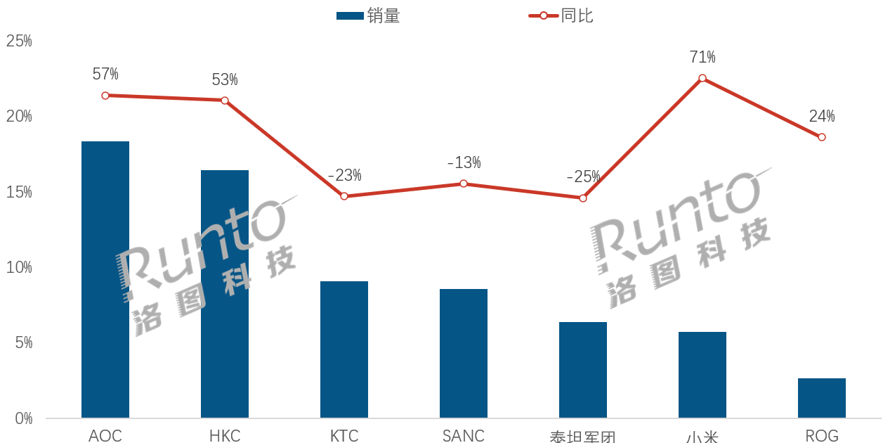 HKC与KTC分别凭借240Hz、260Hz的差异化产品定位分列线上市场电竞产品销量的第二、三位。
