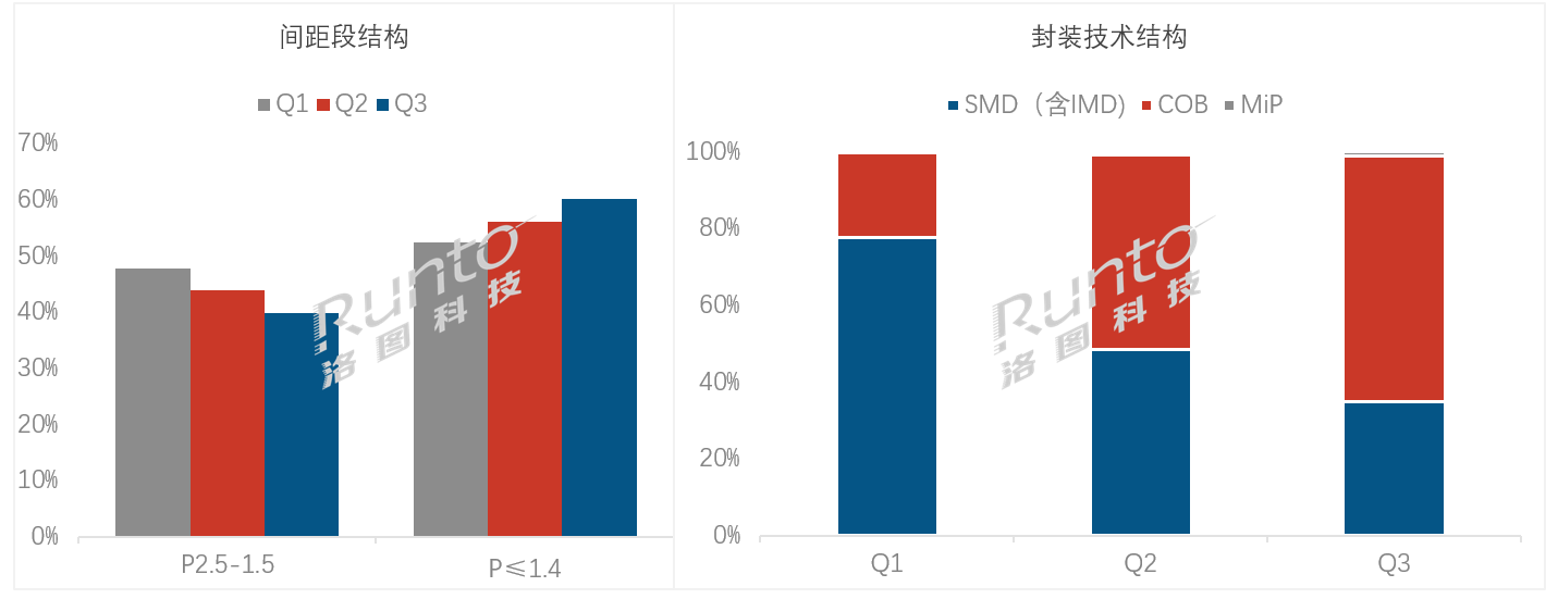 在P1.4及以下间距的产品市场中,政府、公检法司的指挥监控与视频会议场景对COB封装产品需求加大。当季COB产品在该间距段中的渗透率陡升至85.5%,同比增长了34.4个百分点。