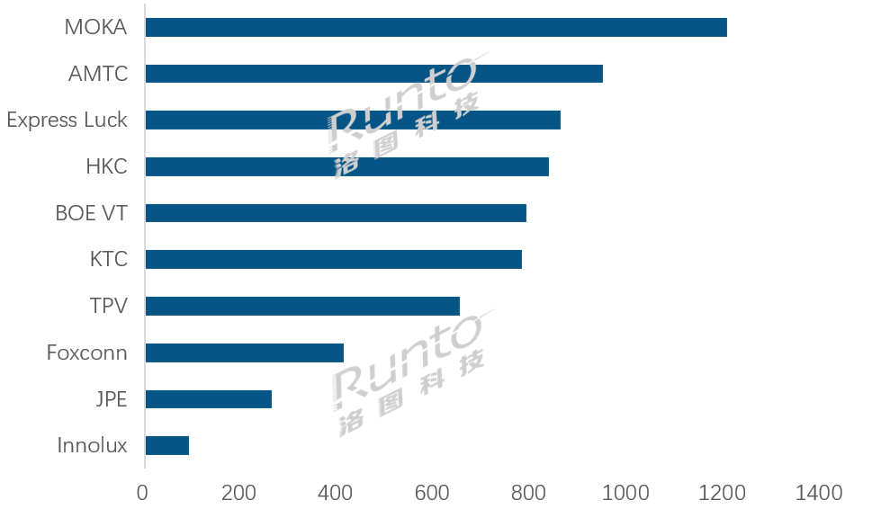 11月,在统计范围内的10家专业工厂中,同比涨跌各半。其中,当月出货量位列前两位的MOKA(茂佳)和AMTC(兆驰)均为下降;同时,KTC(康冠)、Foxconn(富士康)和Innolux(群创)三家出货量的同比降幅均超过了20%。在上涨的剩余五家工厂中,Express Luck(彩迅)和TPV(冠捷)两家同比增幅在30%左右。