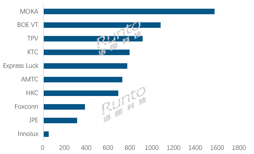 在统计范围内的10家专业工厂中,同比涨跌各半。其中,当月出货量位列前三的MOKA(茂佳)、BOE VT(视讯)和TPV(冠捷)的同环比均录得两位数增幅;此外,Express Luck(彩迅)的同比增幅也超过了10%。