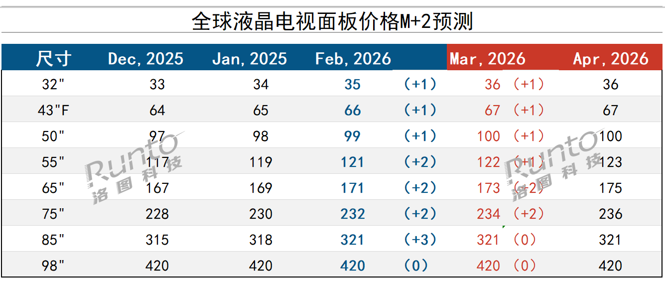 --85寸:2月市场公允价上涨3美元至321美元。市场大型客户多在300-315美元左右成交。暂预测3月维持2月价格。
