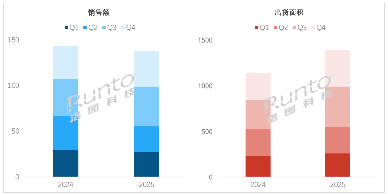 从时间轴上看,市场演绎了清晰的“前抑后扬”走势。上半年,在激烈的价格战影响下,销售额同比下跌16.0%;下半年随着“以价换量”策略效果的显现,出货面积激增36.3%,强力拉动了销售额的反弹,最终实现下半年销售额同比增长6.9%,对冲了上半年的部分跌幅。