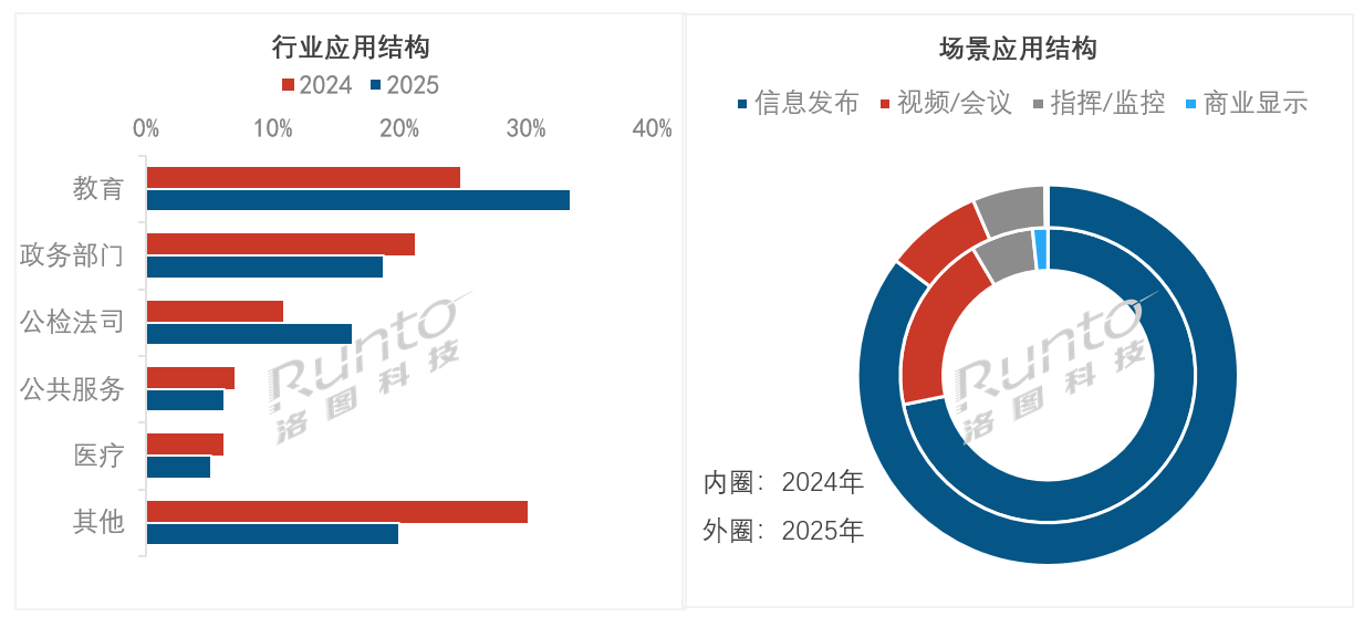 从出货面积来看,教育、政务部门、公检法司、公共服务及医疗五大领域合计占比高达80%。其中,教育行业以33.5%的份额一骑绝尘,成为绝对的压舱石。教育信息化浪潮下,智慧校园、虚拟仿真实训室的建设需求持续高涨。