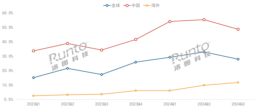 根据洛图科技(RUNTO)数据显示,2024年前三季度,全球激光投影市场中三色技术市场份额超过三成,较2023年同期大涨11.9个百分点。中国市场发展步伐更快,三色激光出货量占比达到53%。