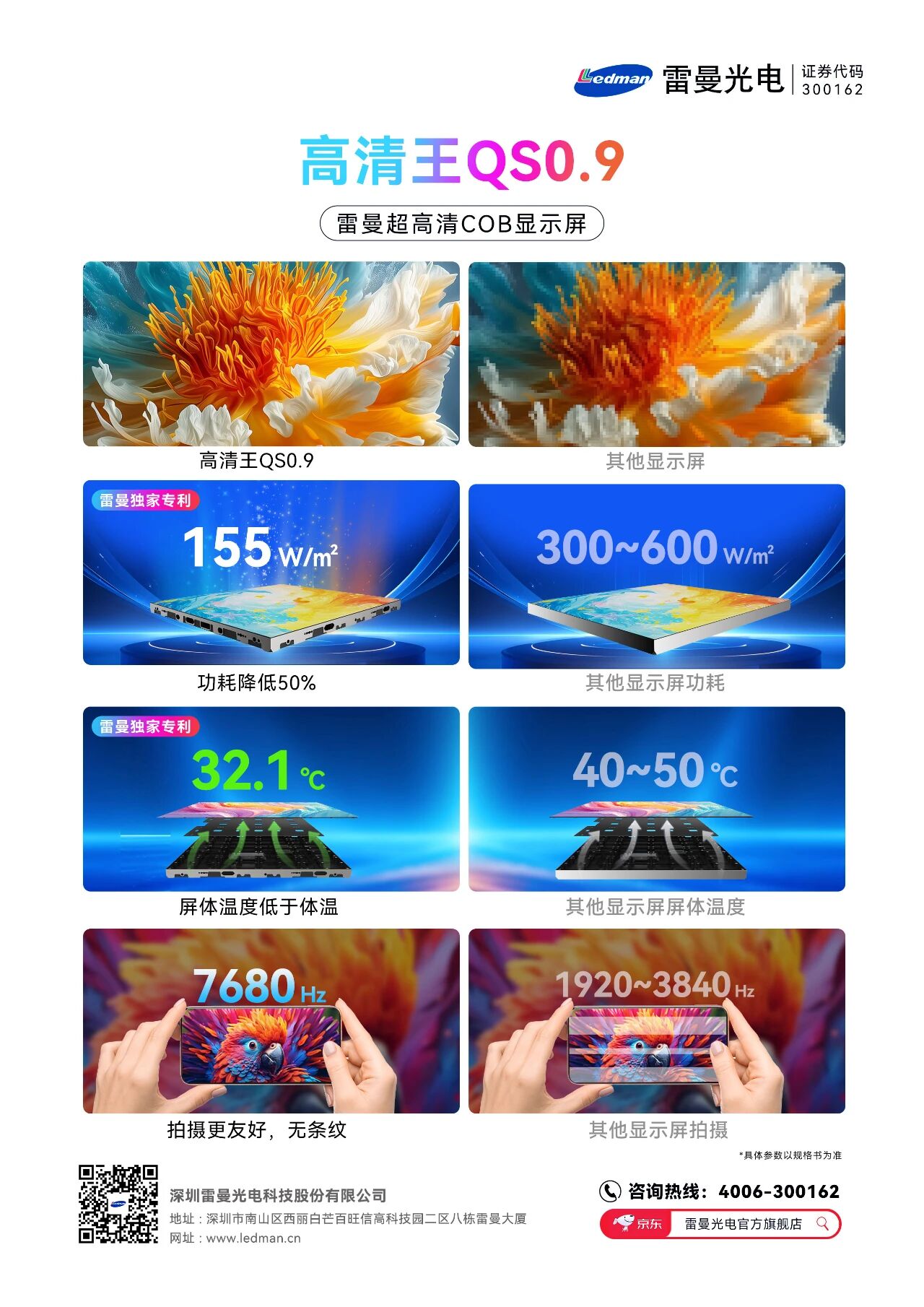 此型号产品汇集雷曼光电十多项前沿技术和专利,切入日益增长的超高清0.9mm间距COB超高清大屏市场,广泛应用于各类高清专业大屏显示、商业大屏显示,高贵不贵,在保证超高清显示的前提下,价格更亲民,能耗节省50%,屏体温度低于体温,高刷新率让拍摄效果更好,低温让产品寿命更长,还有其他更多独有优势!