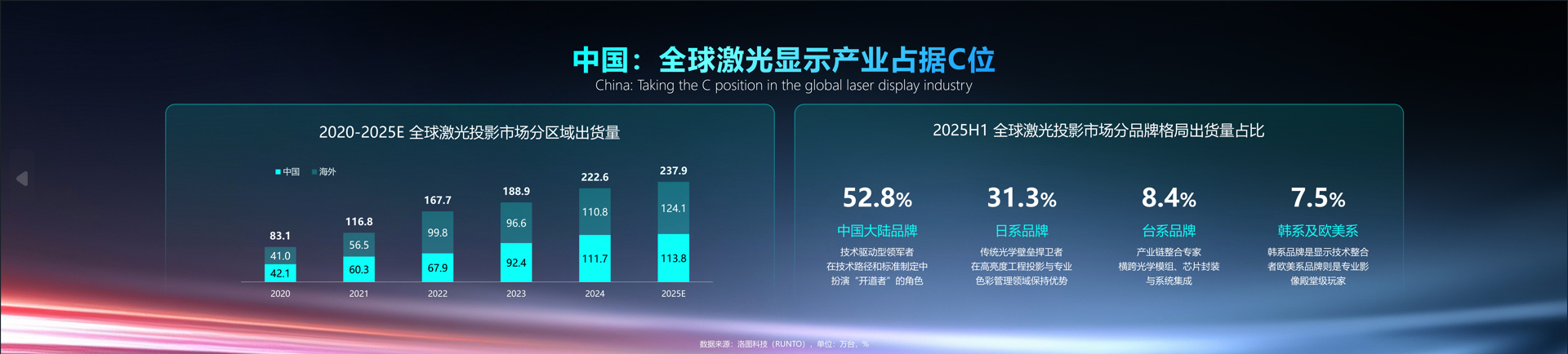根据洛图科技(RUNTO)数据显示,2020-2025年,全球激光投影市场的出货量复合增长率高达23.4%,2025年预计达到237.9万台。在这一浪潮中,中国市场以占全球47.8%的份额成为产业核心。