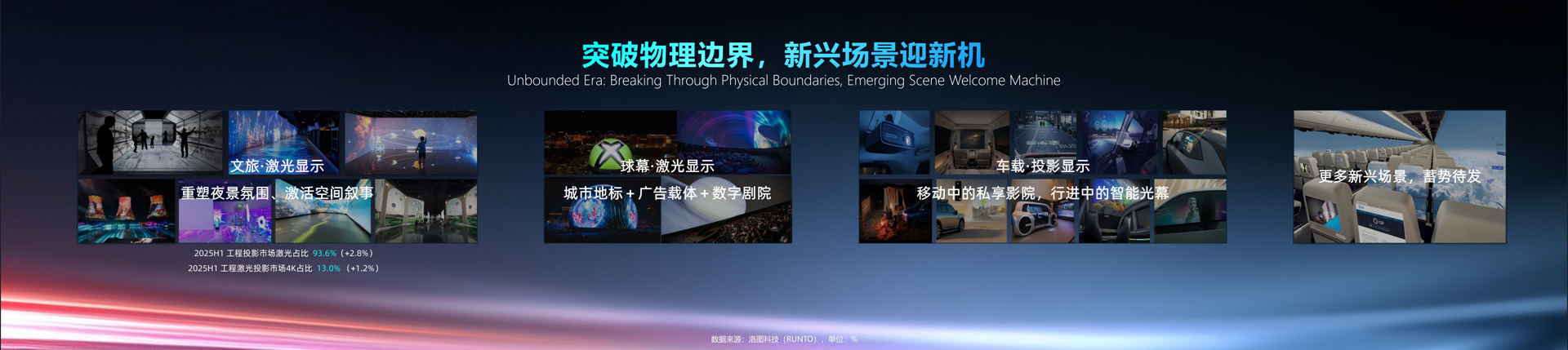 激光显示正在突破物理场景的桎梏。在工程领域,激光技术以93.6%的占比成为绝对主流;球幕投影激活了城市地标、数字剧院等空间叙事;车载场景中,激光HUD和移动影院成为智能座舱差异化竞争的核心战场。