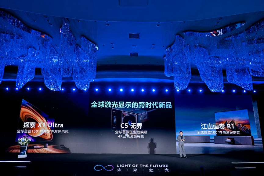 值得关注的是,大会的支持单位海信宣布将向全行业逐步开放1300余项三色激光核心专利,并发布了三款划时代的激光显示新品——全球首款150英寸屏幕发声激光电视探索X1 Ultra、全球首款100英寸可卷曲激光影院江山画卷R1及瞄准电影发烧友的投影Vidda C5无界。