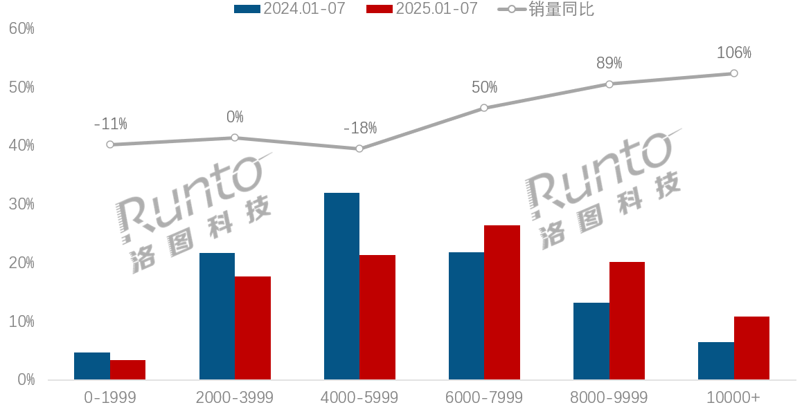 根据洛图科技(RUNTO)线上监测数据显示,这个价格端的销量占比从2024年1-7月的20%提升至了2025年1-7月的31%,变化达11个百分点。这样的变化甚至是在最高20%优惠后的到手价口径下发生的。