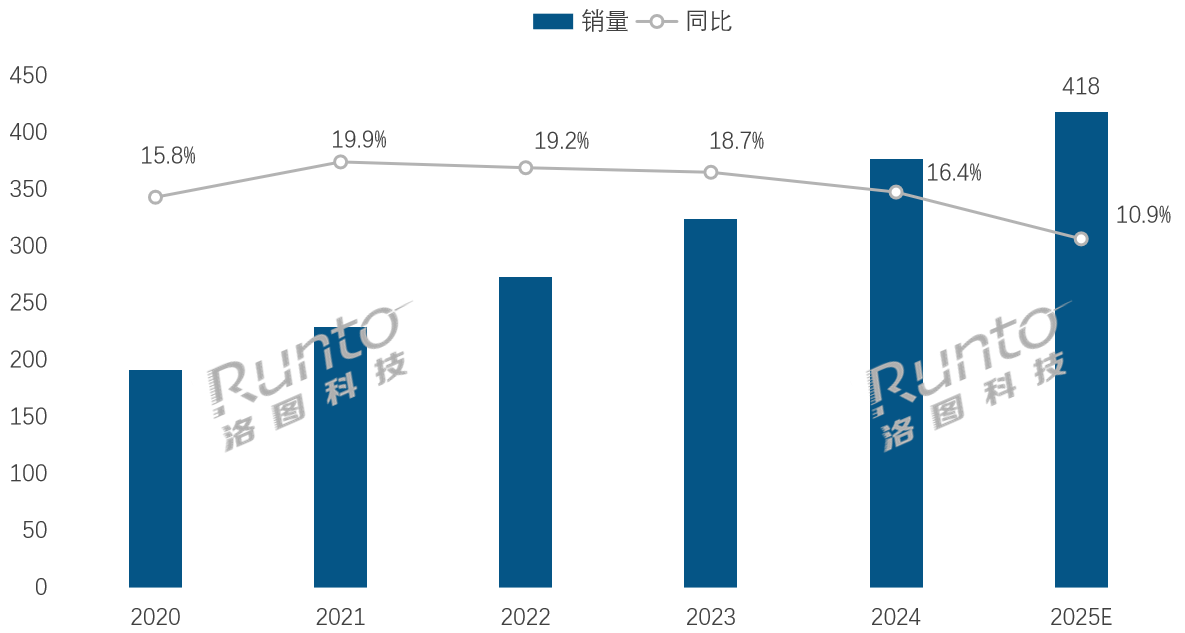 近年来,中国可视门铃市场的销量规模始终保持着年均10%以上的稳定增长。根据洛图科技(RUNTO)数据显示,预测2025全年的市场销量将突破400万台,达到418万台,同比2024年增长10.9%。