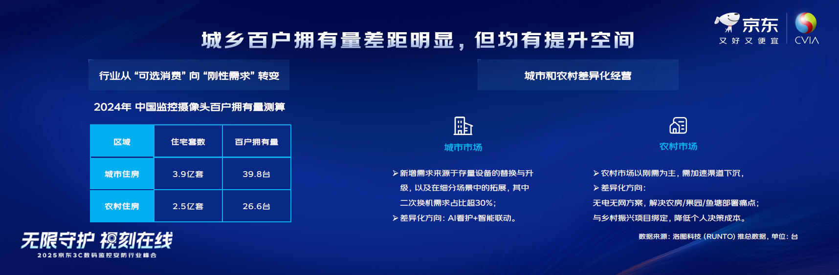 根据洛图科技(RUNTO)推算数据显示,2024年,中国城市住房约3.9亿套,监控摄像头的百户(建筑户数)拥有量为39.8台;农村住房约2.5亿套,监控摄像头百户拥有量为26.6台。(由于早期大量的摄像头废置,用户体感不及统计数据。)