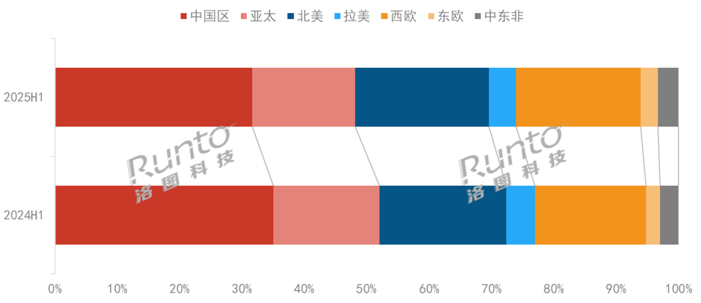 2024-2025H1 全球投影机市场分区域出货量结构