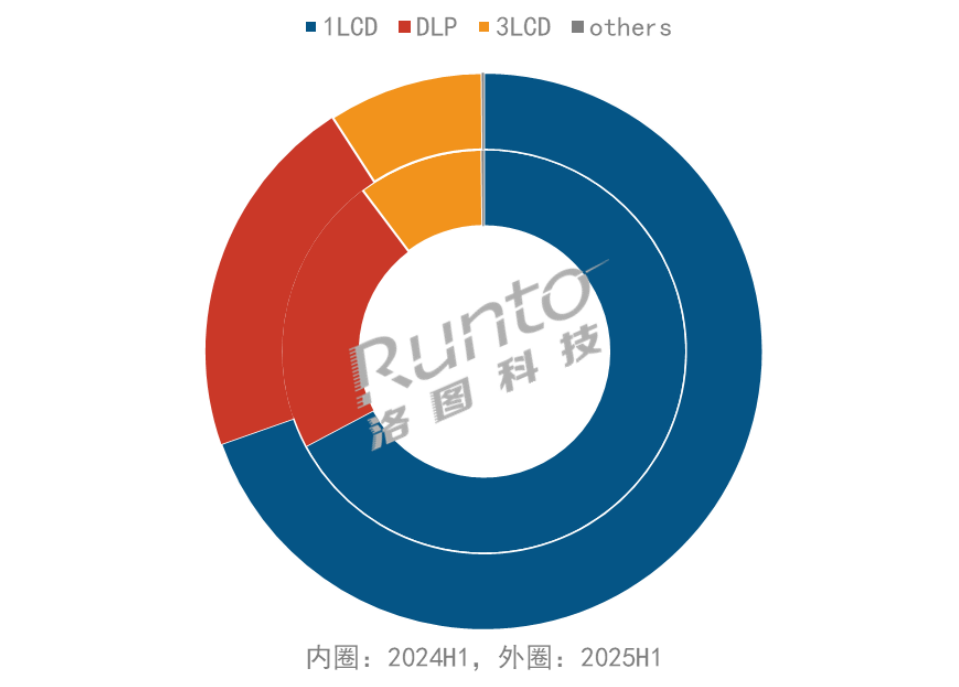 在投影机的技术路线层面,今年上半年各自的出货量也纷纷下滑。根据洛图科技(RUNTO)数据显示,2025年上半年,1LCD产品出货626.6万台,同比微降0.8%;占比为69.6%,较2024年同期上涨2.4个百分点。回落原因一方面仍旧在于炮筒机品类的势头不足,另外则是整体1LCD产品的低端现状导致消费者的反馈不佳,到年中,企业的积压库存和渠道退货率均在上升。