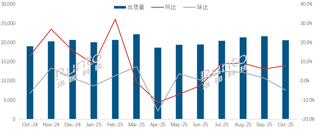 根据洛图科技(RUNTO)发布的《全球电视面板市场出货月度追踪》,2025年10月,全球大尺寸液晶电视面板出货量为20.6M片,同比增长8.0%,环比9月下降4.8%;出货面积为15.1M平方米,同比增长4.5%,环比下降5.9%。