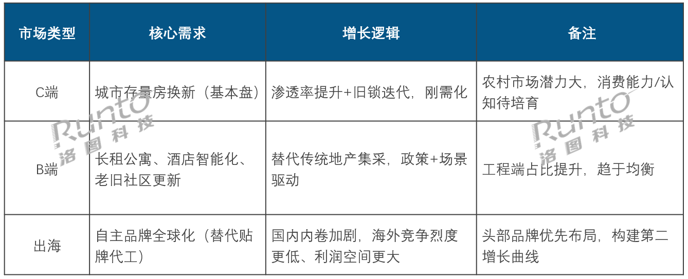 在C端市场,城市存量用户的换新需求构成基本盘;B端市场,增长主力从传统地产转向长租公寓、酒店智能化改造及老旧社区更新等细分场景。农村市场潜力虽大,但受限于消费能力与认知水平,仍需长期培育。