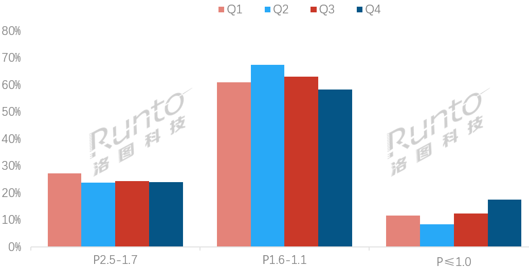 P1.6-1.1作为小间距LED显示屏的主流升级市场,在整体小间距市场的销售额份额已攀升至六成以上。其中,P1.4-1.1间距段作为主力担当,在2025年的各个季度始终保持稳步增长,核心地位持续巩固。