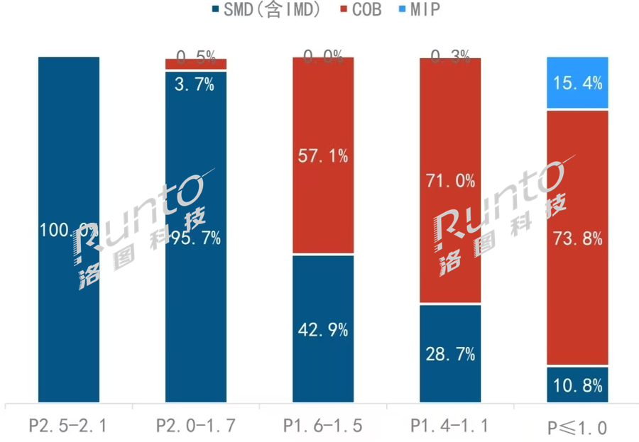 2025年 中国大陆小间距LED显示屏市场按销售额各间距段封装技术结构